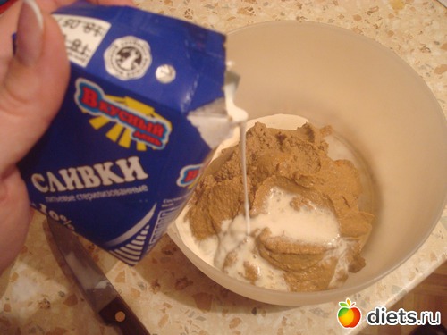 :6. затем добавляем 50 грамм сливок и взбиваем венчиком