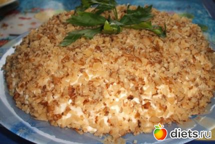 Сверху украшаем тертыми грецкими орехами. После того, как салат немного настоится, подаем к столу.