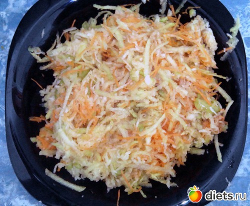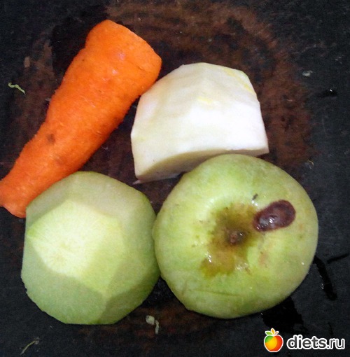 В меню завтрака вошел салат из зеленой редьки, морковки, яблока и кусочка кольраби.
