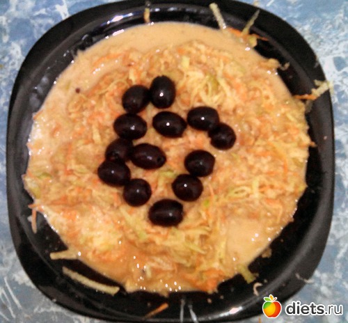 Потом добавил соевый соус, яблочный уксус, горчицу и ряженку. А сверху украсил оливками.