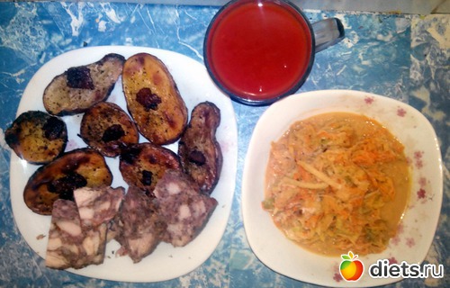Картошка, остатки утреннего салата, последние кусочки мясной запеканки и стакан томатного сока.