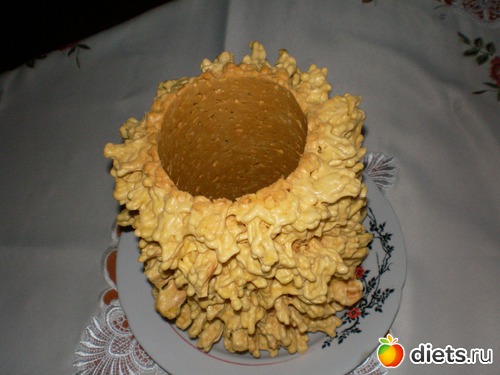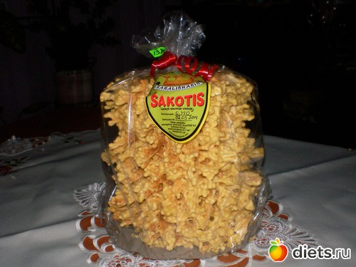 "Торт выпекается на открытом огне на своеобразном "вертеле"...жидкое тесто поливается на "вертел" и во время вращения оно стекает и запекается...тесто постоянно подливают на вертел и за счет этого образуются сосульки разной длины. Торт этот свадебный, но так же его ставят и на рождественский стол, т.к. он напоминает елку"