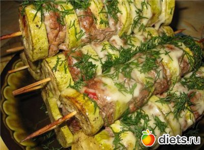 Возьмите деревянные шпажки и поочередно нанизываете: кабачок- фарш-кабачок -фарш… с концов должен быть кабачок.