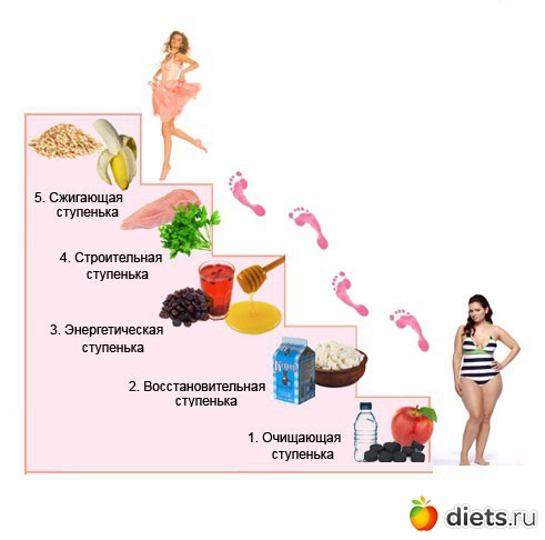Как можно заметить, пятидневный рацион диеты разделен на своеобразные ступени, делающие эту программу законченной и осмысленной. Благодаря этому, после завершения последнего 5-ого дня диеты, Вы можете спокойно преступить к самому первому, т.е. начать «Лесенку» заново. Либо, по собственному желанию сделать перерыв на нужный Вам срок и вернуться к диете тогда, когда сами этого пожелаете.