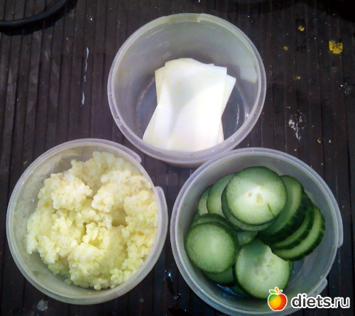 Огурец, пшенная каша и сулгуни. В этот раз каша без масла, но с солью.