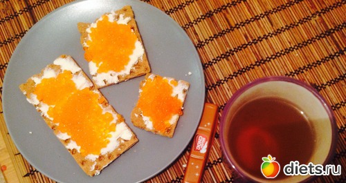 Завтрак - 2 ржаных хлебца с творожным сыром и икрой форели, шоколадка маленькая, зеленый чай