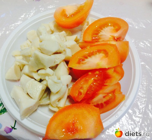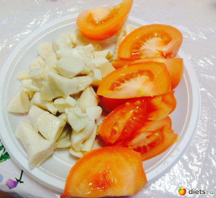 Обед был экспромтом))) так как приготовить на выходных мне ничего не удалось, в ход пошли консервы) обедала я мясом кальмара, помидором