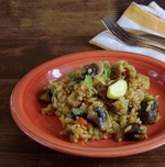 5. Тушить на среднем огне в течение 20 минут, потом сделать убавить до минимума и оставить до полного впитывания воды. Пока все готовится - желательно рис не шевелить.