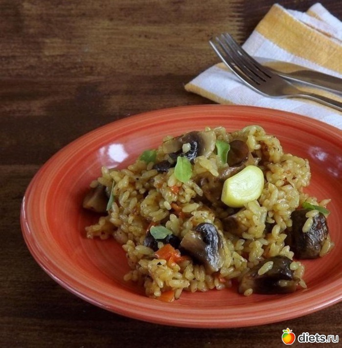 3. К моркови и грибам добавить еще 1 ст.л. растительного масла и засыпать рис. Хорошо все перемешать и дать рису впитать в себя масло.