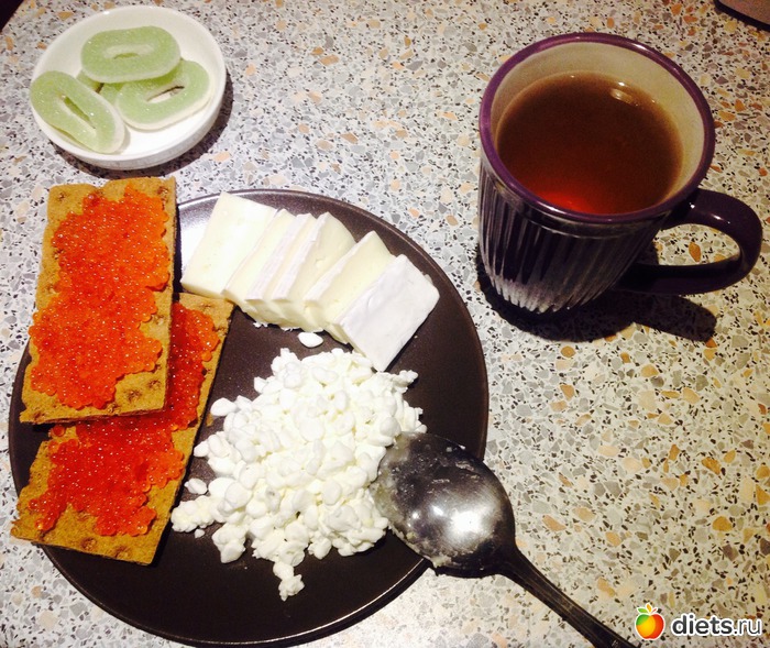 Хлебцы с икоркой (подождите, мне осталось соблазнять вас совсем чуть-чуть!!! Там всего 250 грамм, я почти уже ее доела), рассыпчатый творожный сыр 2% жирности, сыр бри и зеленый чай с мармеладками.