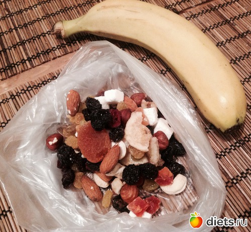 Перекус был ранним, около 09.45. Сухофрукты, банан и зеленый чай