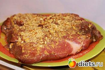 Вынуть мясо из маринада (маринад сохранить), намазать горчицей, посыпать прованскими травами и орехами.