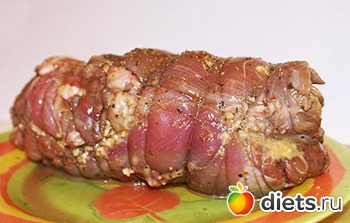 Свернуть посыпанное мясо плотным рулетом, перевязать.