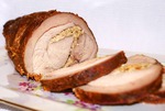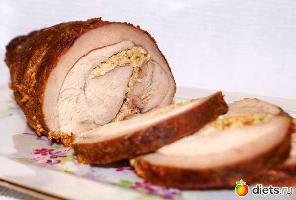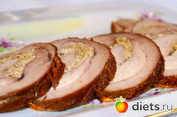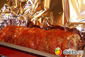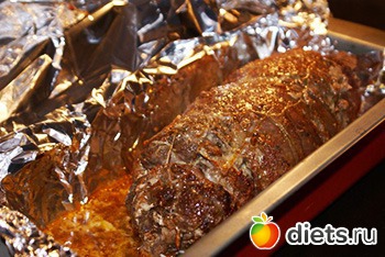Запекать рулет при 230 гр. С 35 мин., после этого осторожно раскрыть фольгу, убавить жар до 180 гр. С и продолжить запекание, поливая рулет маринадом.