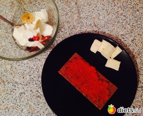 Завтрак был маленьким - хлебец с икрой, сыр бри и 2 ложки йогурта с чуточкой сухофруктов.