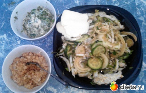 Салат из пекинской капусты, огурца, лука и зелени. Плюс пять грамм подсолнечного масла. Геркулес на воде. Яйцо с зеленью из микроволновки. И немного сулгуни.