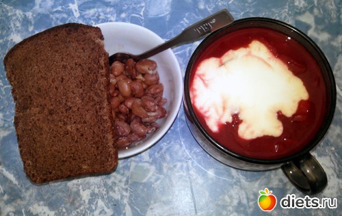 Борщ с ряженкой. Кусочек хлеба. И фасоль.