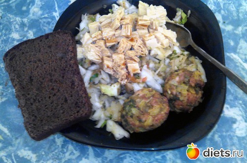 Я немного поразмышлял и соорудил салат из белокочанной капусты, яблока и лука. И чуточку зелени. Потом добавил ряженки, но она в кадр не попала.