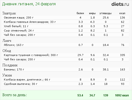 Diets.ru Мое меню на сегодня!