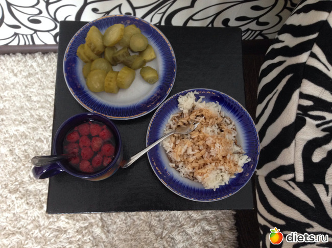 Мама сказала что моя диета ее не волнует и принесла мне в постель вот такую вкусняшку))))рис с соевым соцсом, огурчики маринованные и чай с малиной Читать полностью