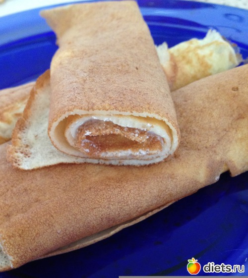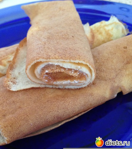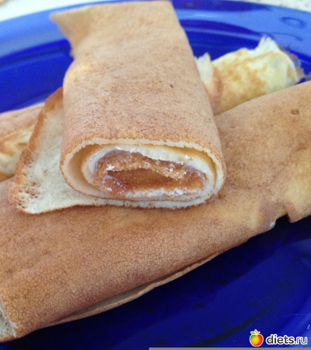 Из этого количества теста получается от 10 до 12 блинчиков, т.е. в 1 блинчике -- примерно 1 ст л крахмала. Я оставила себе 2 блинчика на 2 дня, а остальные начинила для семьи сладкой творожной начинкой. Масленница все-таки!