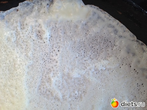 Все тщательно вымешиваем, даем постоять, чтобы крахмал разбух, процеживаем, если надо, через сито. Выпекаем тончайшие блинчики на хорошо разогретой практически сухой блинной сковородке. Перед каждым блинчиком тесто помешиваем, т.к. крахмал оседает на дне.