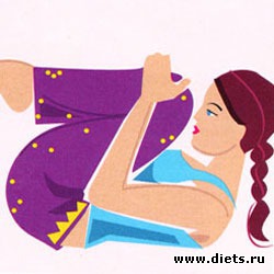 Исходная позиция: лежа на спине. Подними колени и прижми их к груди. Обхвати ноги руками и, приподняв голову, тяни ее к коленям. На выдохе прижимай ноги к груди, на вдохе опускай ноги и голову, но не касайся пола! Повтори упражнение 4-5 раз.