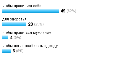 Я вот худею исключительно для себя. Потому как на мой маленький рост виден каждый лишний килограмм. И есть определенные моменты в моем теле, которые я хочу изменить. Есть одежда, которая на мне будет сидеть лучше, если я буду меньше.