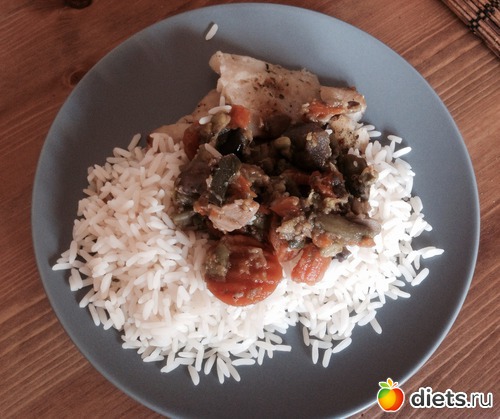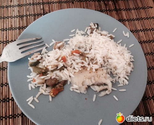 Рис, филе пангасиуса на пару со специями, остатки овощной смеси "Сицилийская".