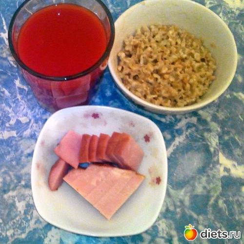 Овсяная каша, фрикаделька, томатный сок.