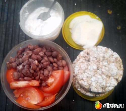 Помидорка, фасоль, сулгуни, сметана 10% и пара слайсов.