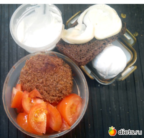 Помидорка, котлета, хлеб, сулгуни, сметана 10% и зефирина. А! Потом были еще три печеньки! Они на фотку не попали.