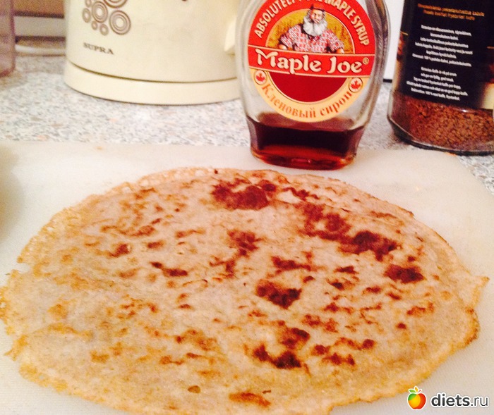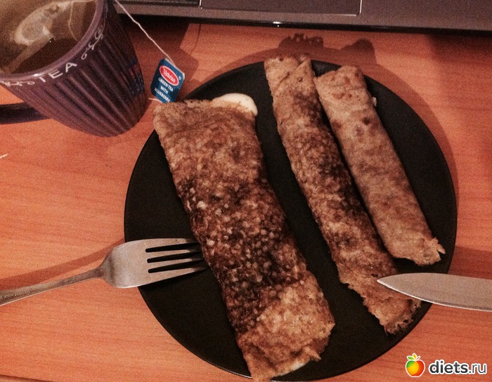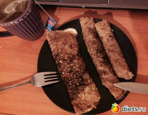 Итак, вчера вечером я испекла блины) типа низкокалорийные)) в принципе, все, что я сделала - это заменила пшеничную муку на ржаную, яйца на белки, молоко на воду, сахар на чайную ложку клинового сиропа. Получилось нечто...в общем, нечто получилось ))))