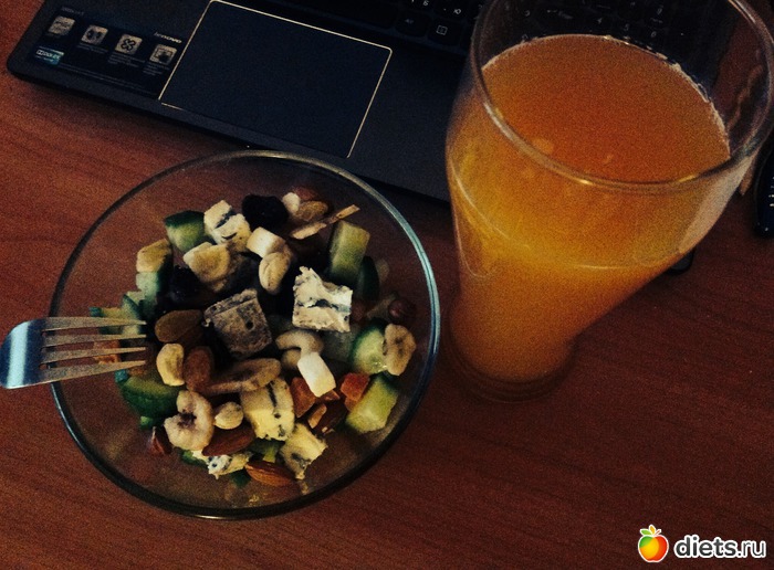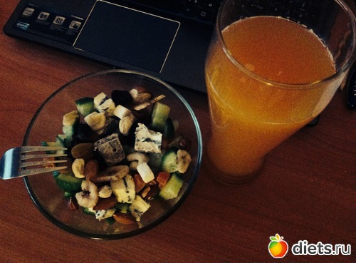 Потом, пока комната проветривалась, приготовила себе салатик - огурец, помидор, сельдерей, сыр Данниш Блю (с плесенью), немного сухофруктов)
