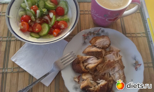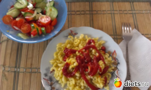 были макароны с томатным острым соусом...салат из свежих овощей(огурцы..помидоры..лук...болг. перец..соль...лимонный сок...масло) прошу прощения..за качество фото...