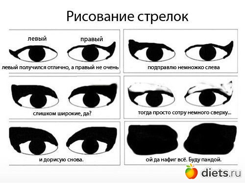К счастью, на эти грабли наступила только один раз и уже её сестру накрасила отлично, делала уголки на верх причём в полу дисковой форме и с закруглением у внешнего уголка глаза. Глаза сразу стали смотреться огромными и взгляд молодой. Женщине очень понравилась, она сказала, что меня больше не отпустит - приятное чувство.