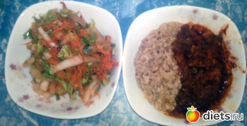 Салат из пекинки, яблок, сельдерея и лука с зеленью. Овсяная каша - не путать с "Геркулесом". И приготовленное вчера мясо.