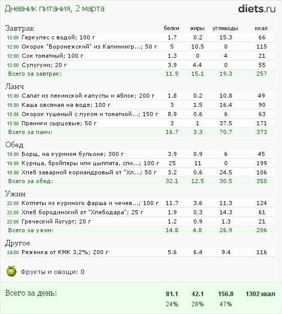 А я сегодня даже считать не стала- ходили в лес на празднование Масленицы, ела свли блинчики с начинкой- спасибо статье Парад начинок здесь с сайта- любимые мужчины очень заценили мои блинчики.. А с завтра снова начну путь к себе