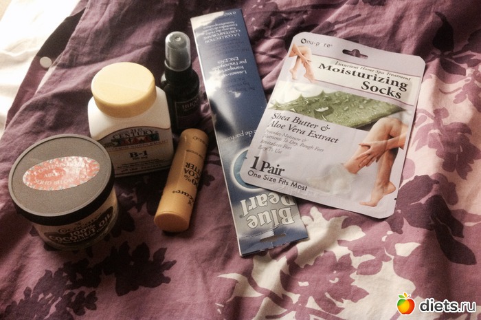 Витаминчики группы B1, кокосовое масло (использую его для волос), ароматическая вода с запахом лаванды, арома-палочки с различными ароматами - от кокоса и ванили до розы и илонга-илонга, какао-масло (использую его для сухих участков тела, в том числе для век, губ, локтей и прочее), еще в подарок положили носочки с алое.