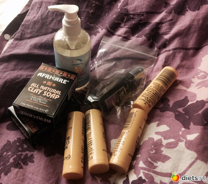 Стикеры с какао-маслом, черное африканское мыло, детский органический шампунь, лавандовая водичка.
