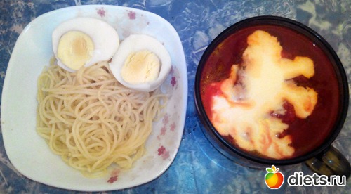 Борщ, забеленный ряженкой. Спагетти и вареное яйцо.