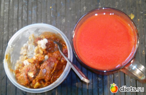 Стакан томатного сока. Перловка и тушеное мясо. Ниче так пошло.