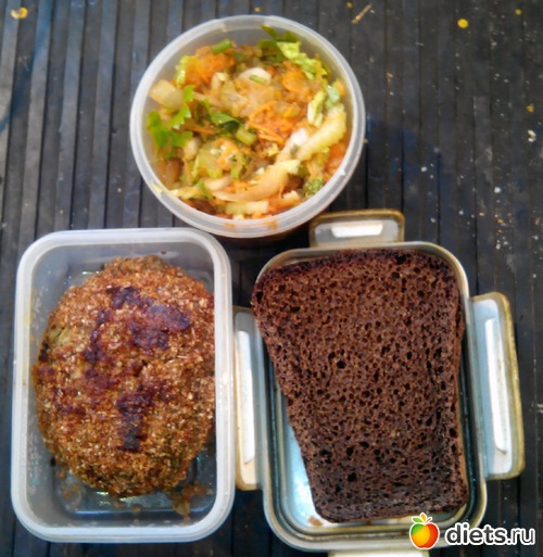 Салат из пекинки и яблок. Котлета курино-чечевичная. Кусок хлеба. Плюс еще одна зефирина. Вот тут я точно наелся!