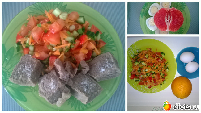 Ужин: 2 яйца в смятку, овощной салат и апельсин.