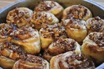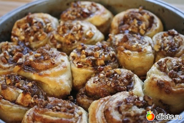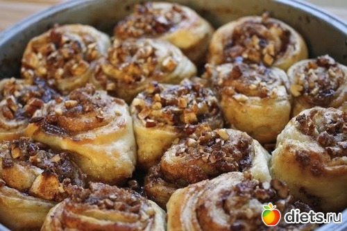 Рулет смазать взбитым яйцом, затем острым ножом нарезать на кусочки шириной 3-4 см. Переложить в смазанную форму на небольшом расстоянии друг от друга. Затем посыпать сверху рублеными грецкими орехами.