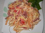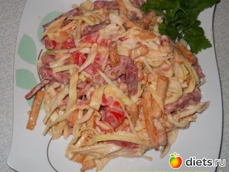 Нашинковать белокочанную капусту тонкой соломкой, пекинскую – неширокими (0,5-1 см) полосками. Нашинкованную белокочанную капусту перед добавлением в салат лучше посолить и слегка обмять, чтобы она была более сочная и мягкая. У помидор вырезать середину и нарезать некрупными ломтиками. Луковицу очистить и нарезать тонкими полукольцами. Колбасу – соломкой.
