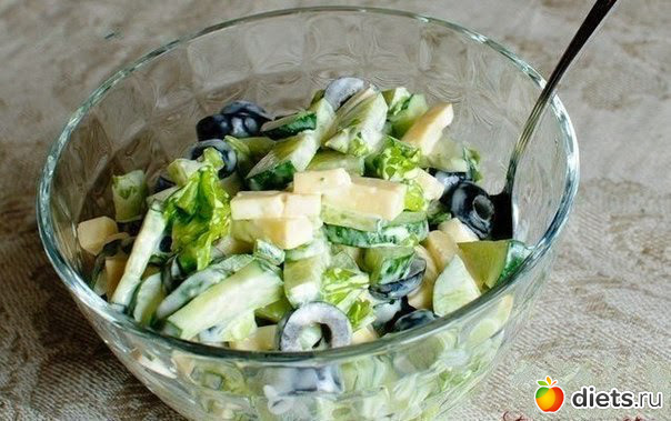 1. Огурцы нарезать небольшими брусочками, маслины - колечками, а сыр - кубиками.