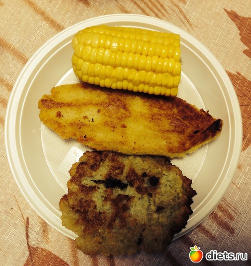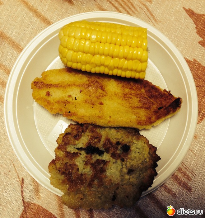 Половина початка кукурузы, капустная котлета и 1 дранник