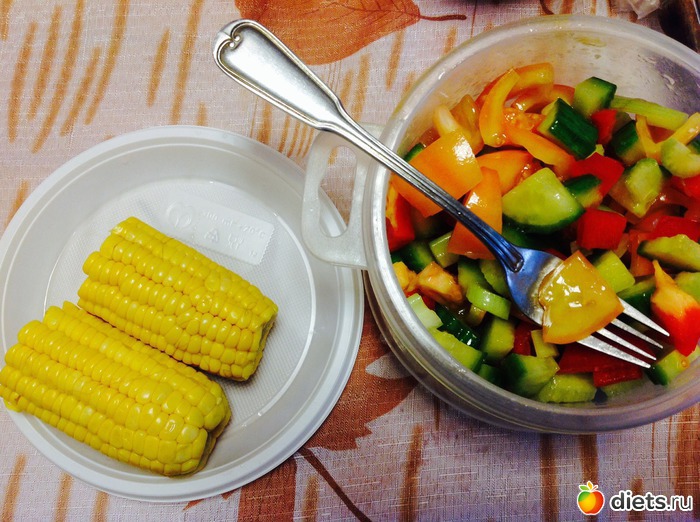Обед был как всегда, в 13.00 - салат из свежих овощей (огурец, помидор, сельдерей, перец) и 1 початок кукурузы