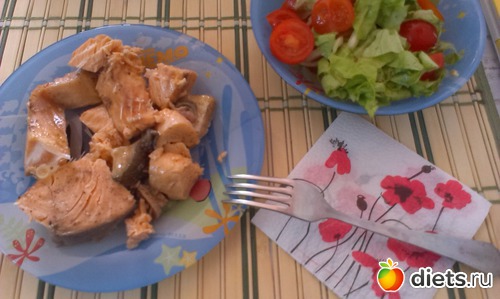 Обед: форель в соевом соусе (соль..чёрный перец) на пару + салатик...